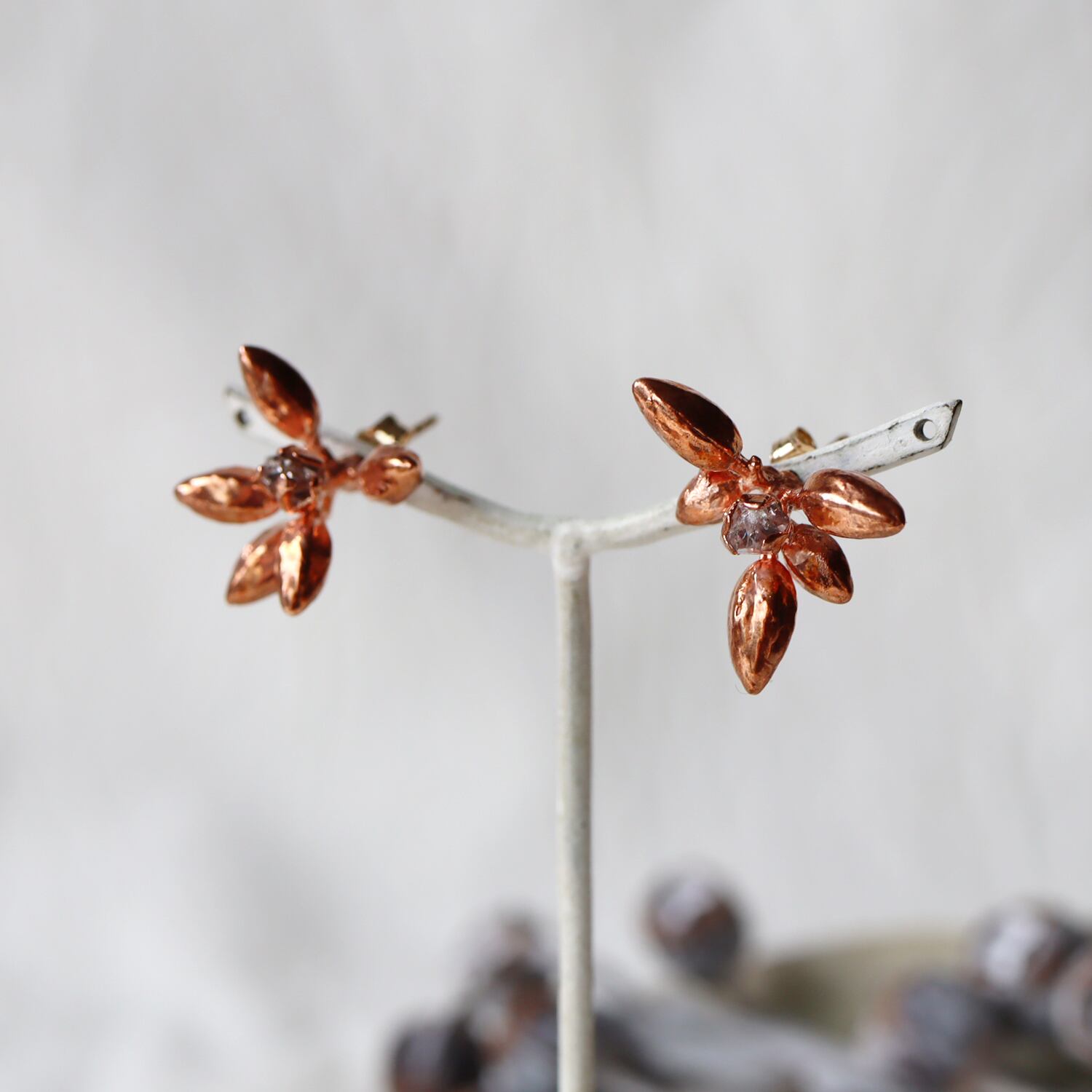 お花のように実った木の実の中で一粒だけ輝く原石ダイヤモンドクォーツのピアス。