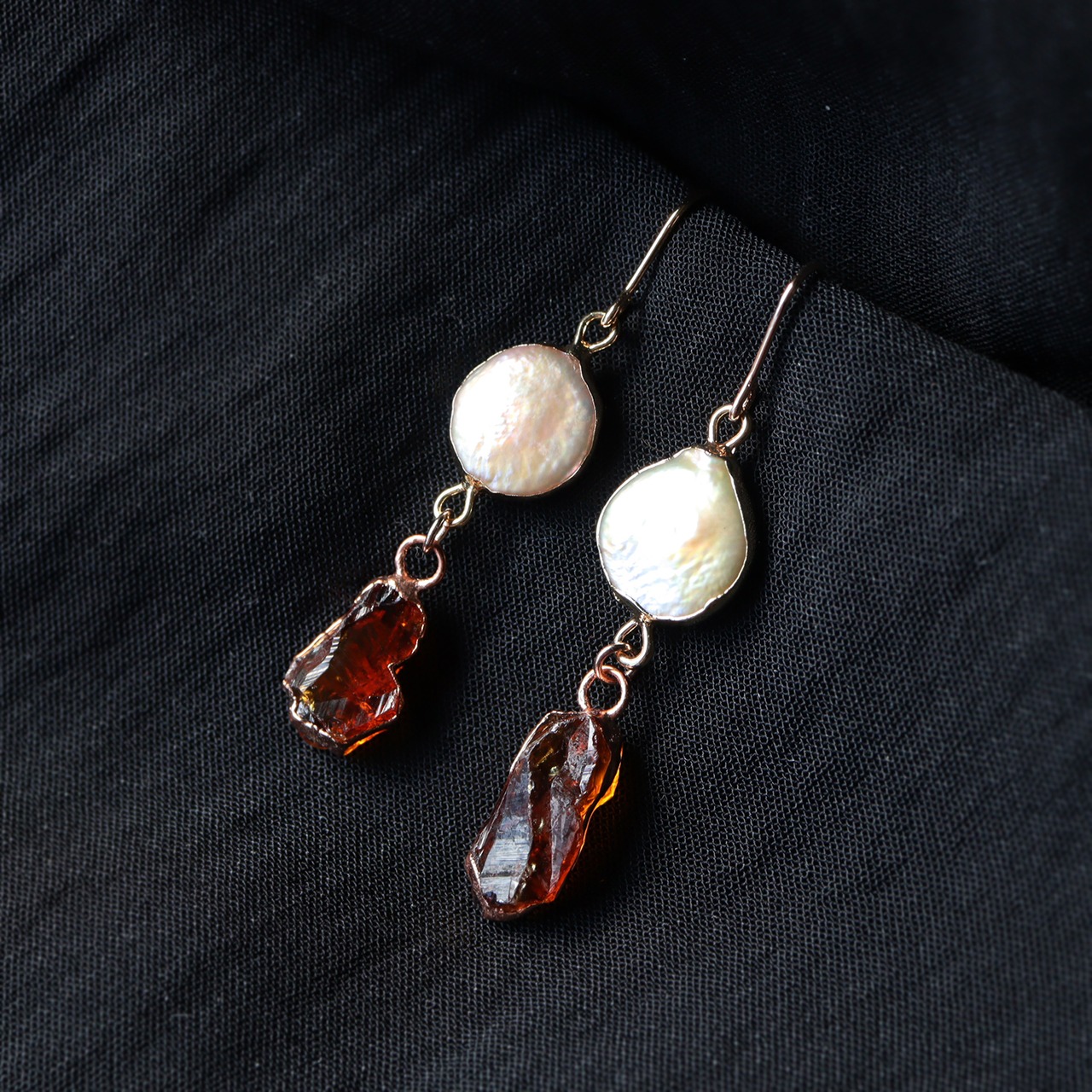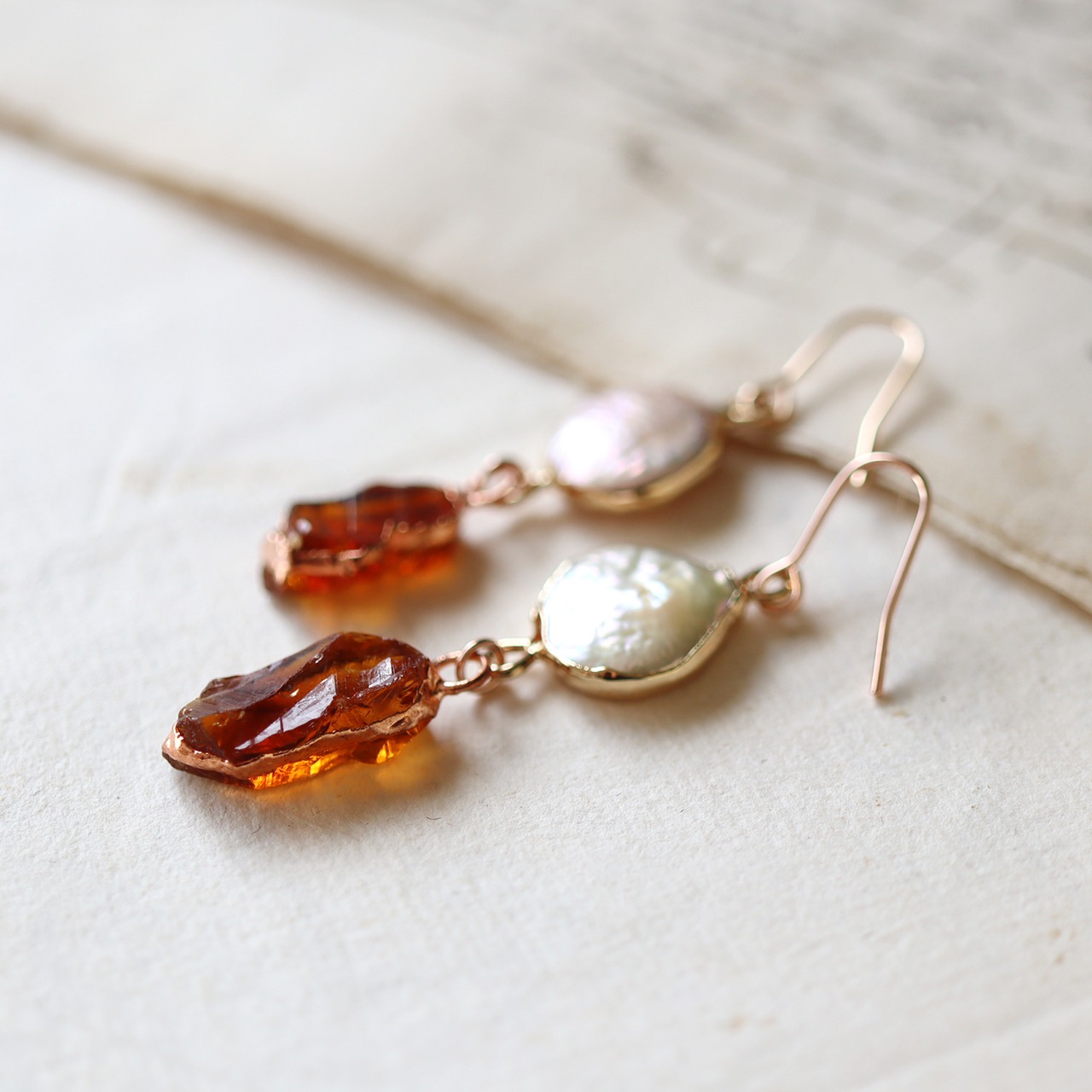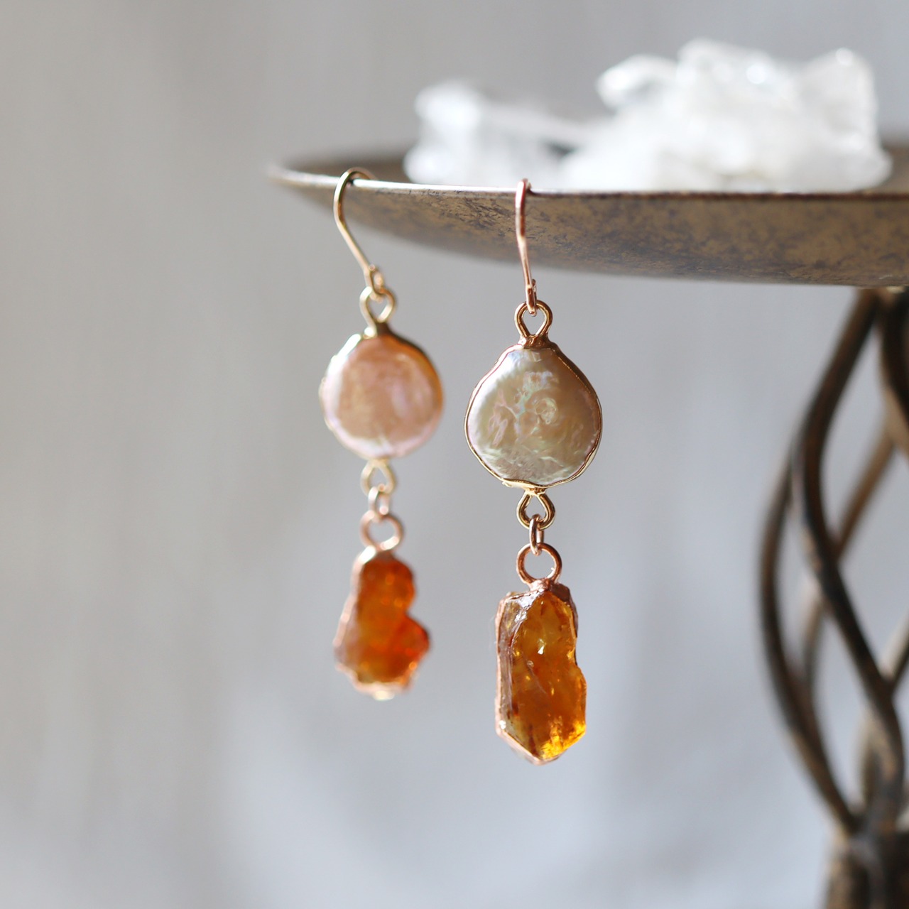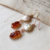 ナチュラルな凹凸と上品な艶が魅力的なコイン型のパール。蜂蜜を煮詰めたような色味と透明感が印象的な原石のシトリン。