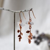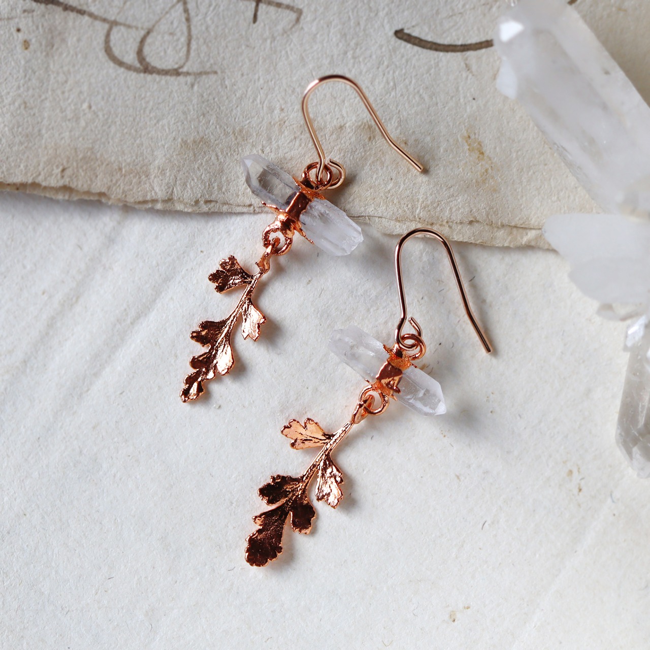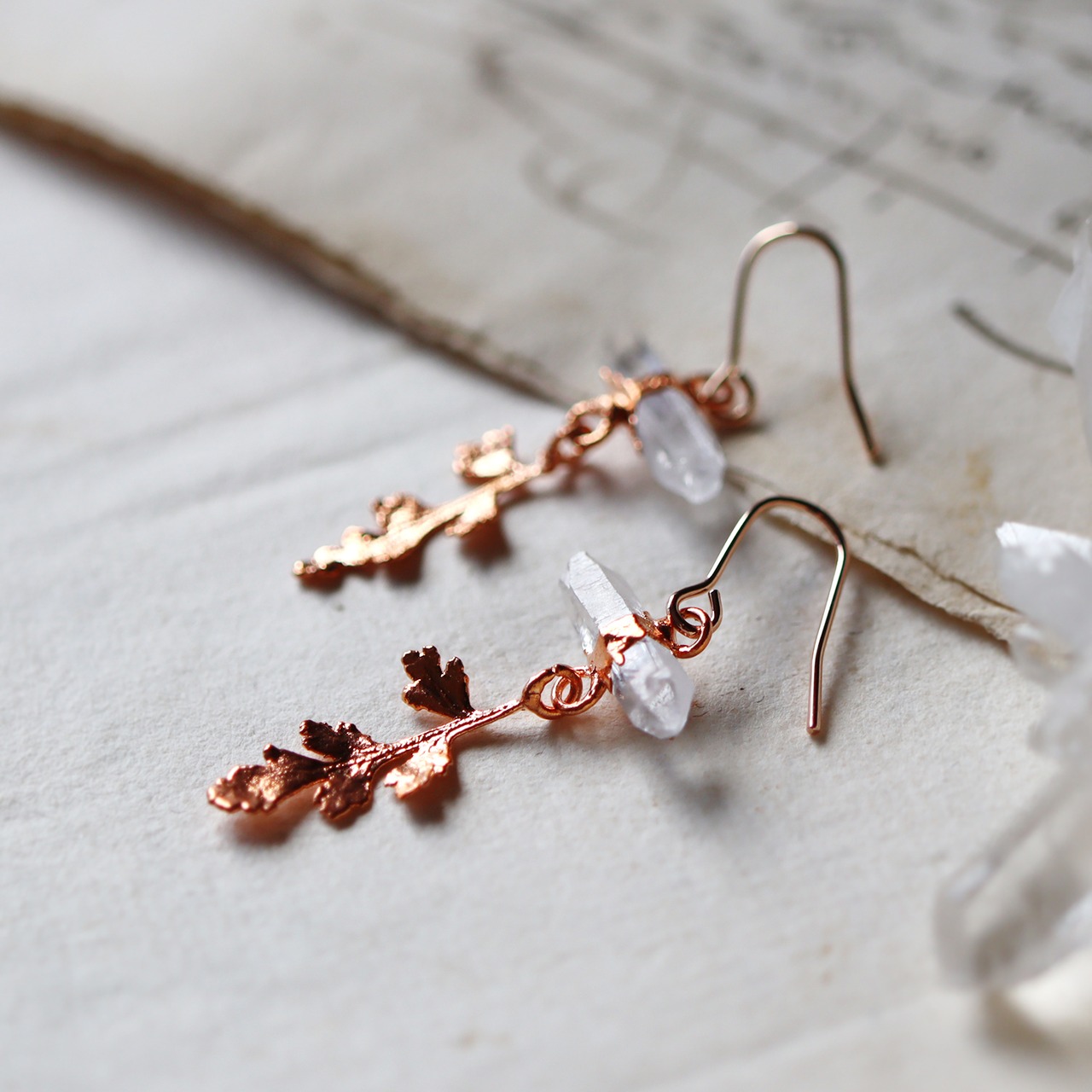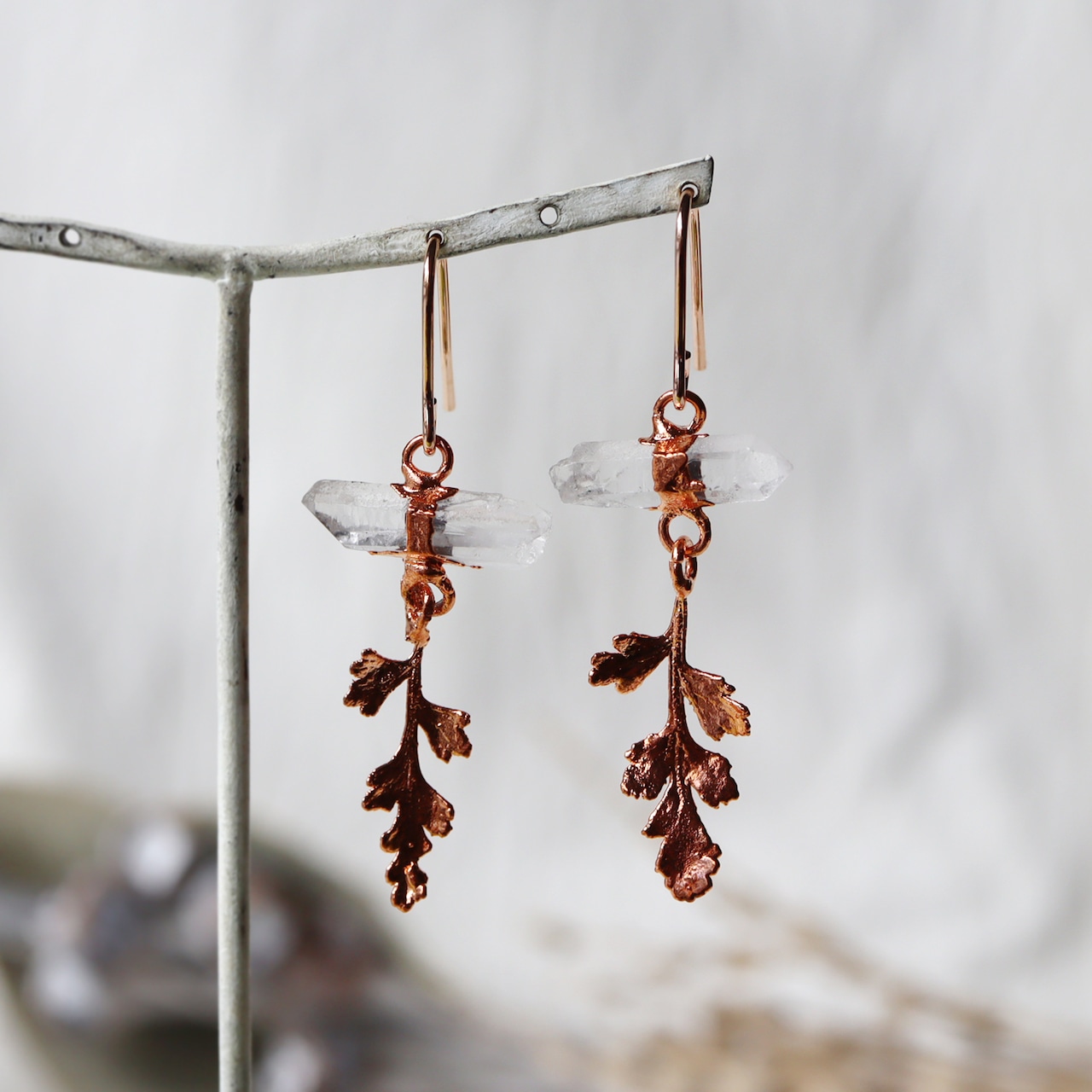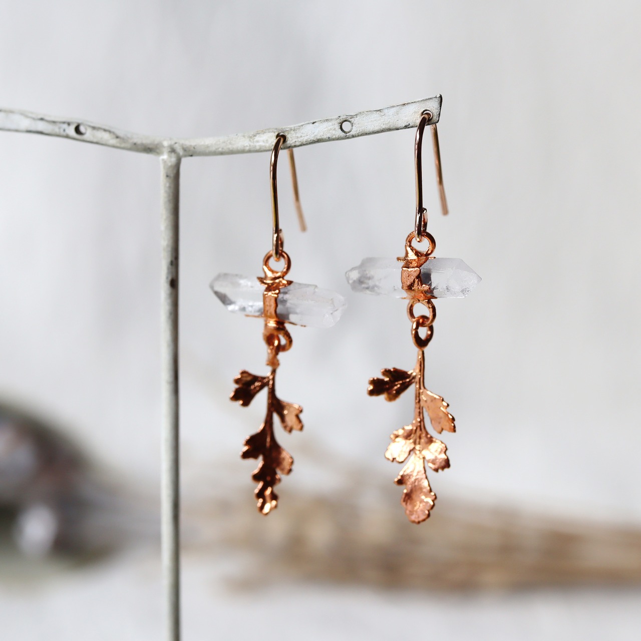 鉛筆型に育つ結晶そのままのクォーツから、葉っぱが生い茂るようなピアス。