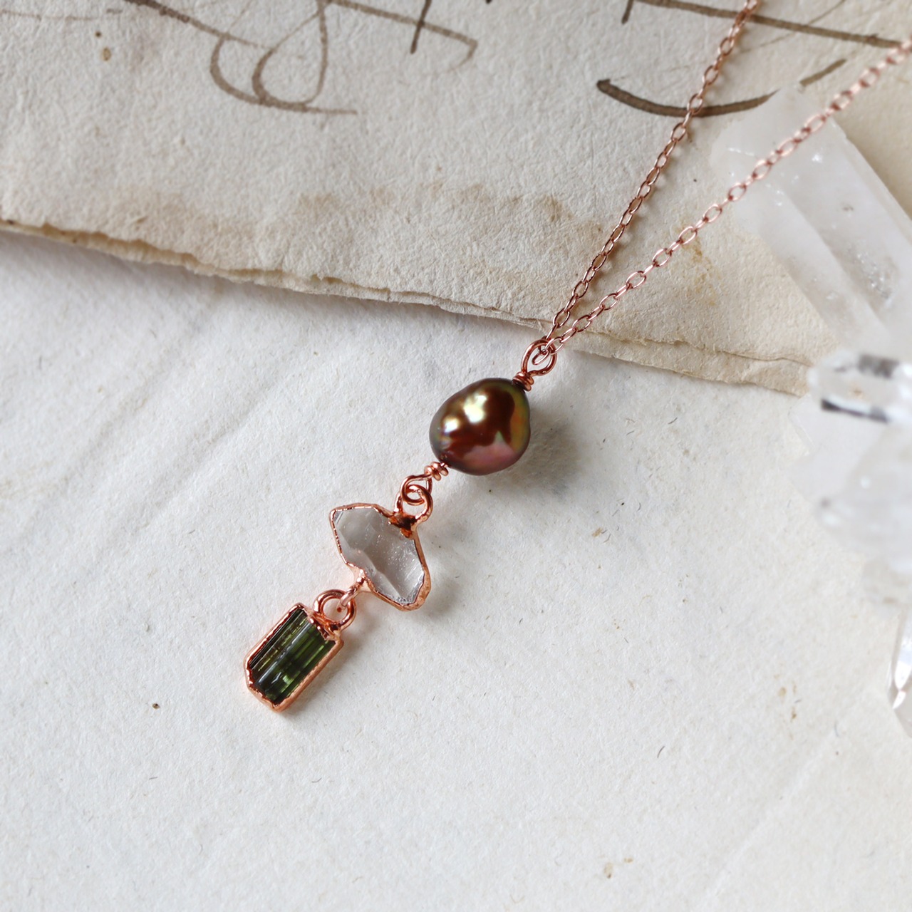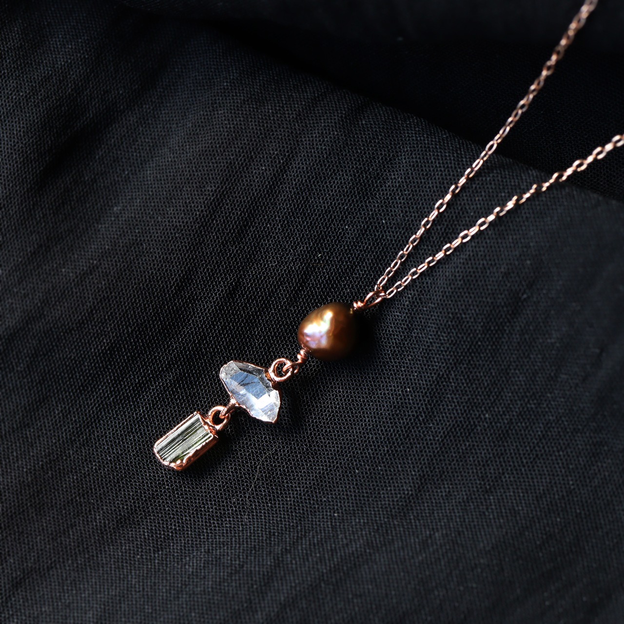 上品なブラウンのパール。原石そのままの形、強い輝きと透明感のダイヤモンドクォーツ。柱状結晶、深いグリーンが美しいトルマリン。