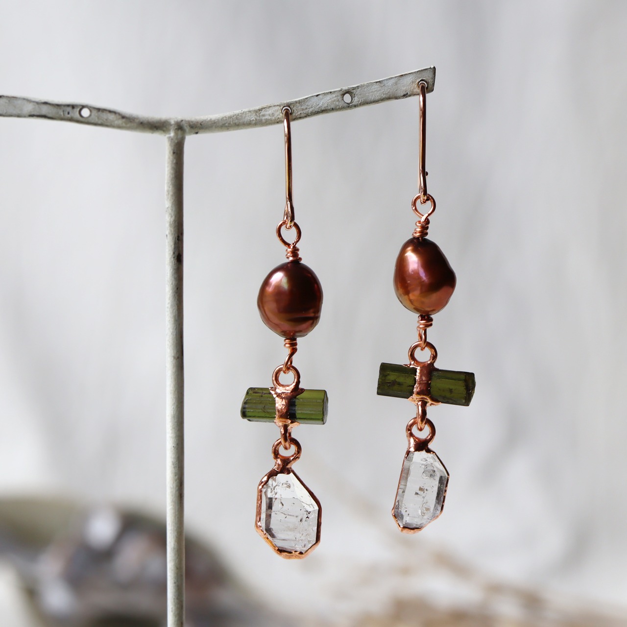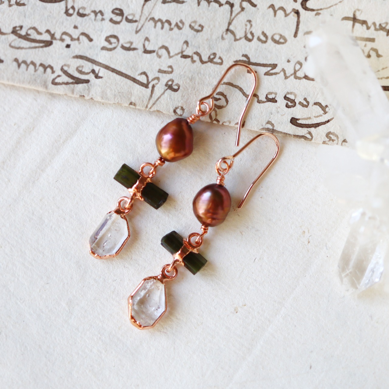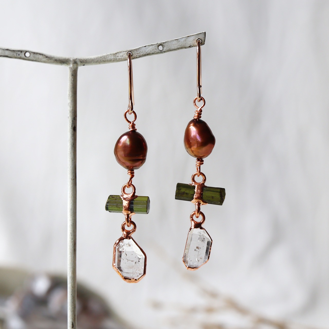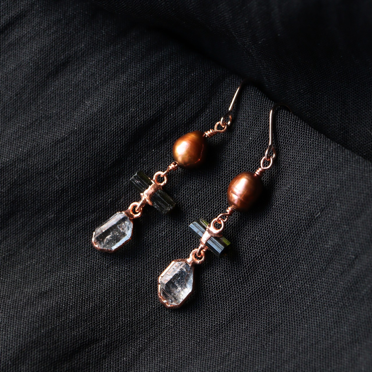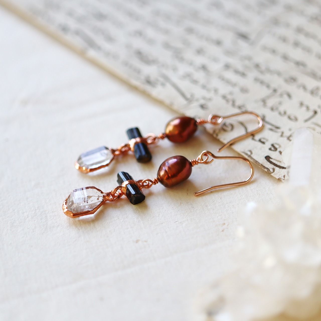 素材:パール・トルマリン(アフガニスタン産)・ダイヤモンドクォーツ(パキスタン産)・銅
