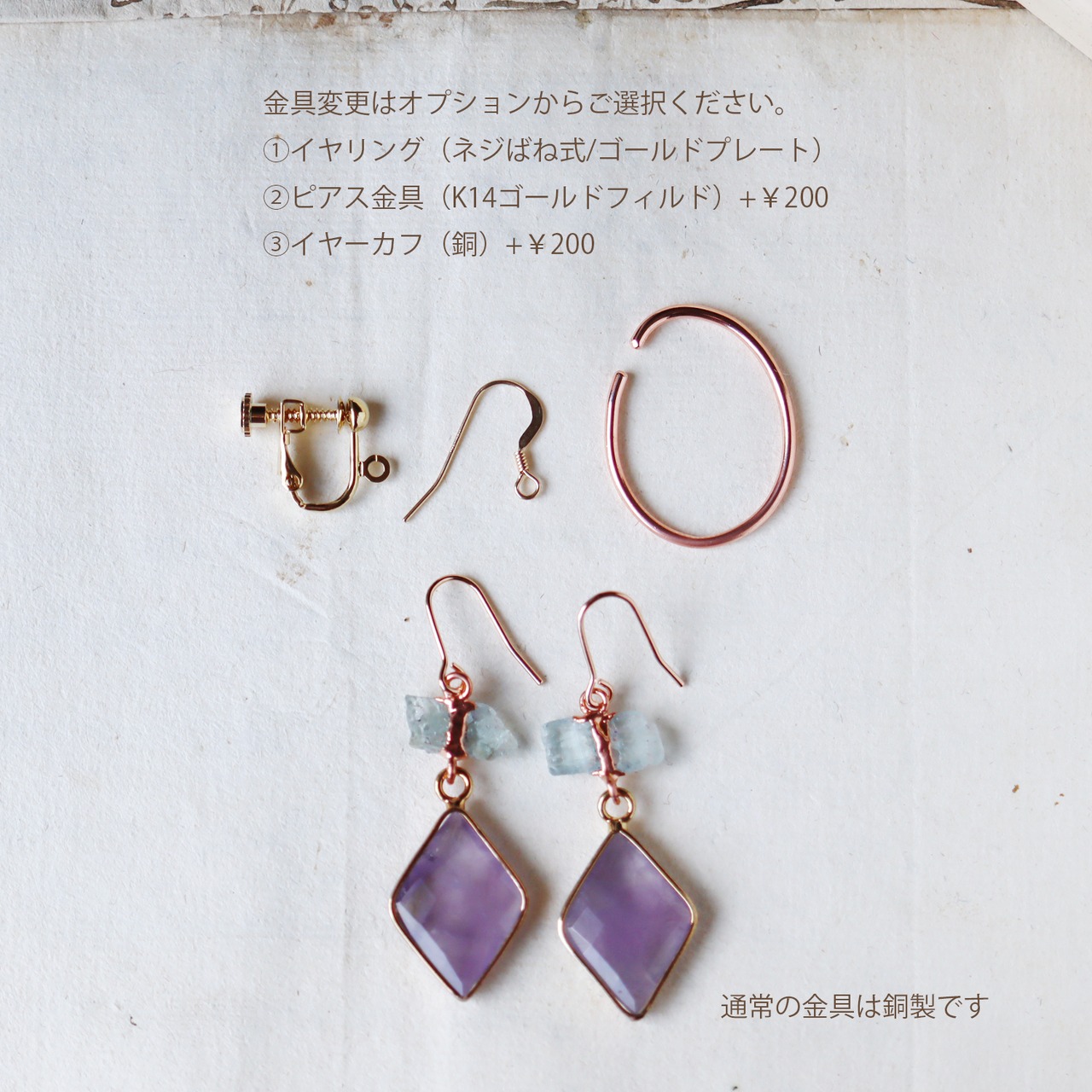 初めはピンクゴールドに似た色味ですが、空気中の酸素・水分・人間の汗や皮脂にって経年変化し、使い込んだアンティークのような質感に変化していきます。変化が気になる場合は、アクセサリー用の磨き布、金属磨き液などを使えば輝きが蘇ります。基本的に変色・アレルギーを抑えるコーティングを施しています。