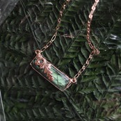 グレーの石の中に、角度によってグリーンの光が浮かぶラブラドライト。大粒で石の正面にはっきりと色味が浮かぶものを使用しました。ミステリアスな天然石と繊細な葉っぱを組み合わせたネックレスです。