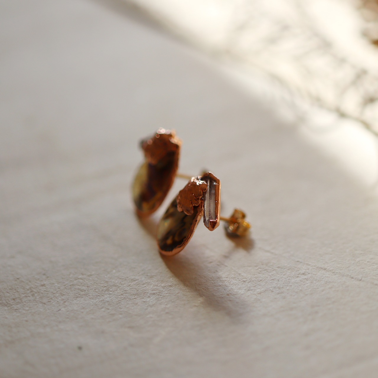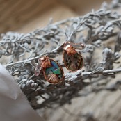 素材である銅は、赤みのある金色があたたかく、使い込む程にアンティークな質感へと変化していきます。天然石のラフな輝きと植物の造形。自然そのままの美しさで耳元を飾るアイテムです。