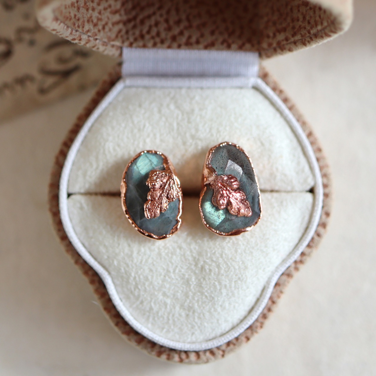 グレーの石に角度によってブルーグリーンの神秘的な光が浮かぶラブラドライト。キャンディのような天然石と繊細な葉っぱを組み合わせたピアスです。