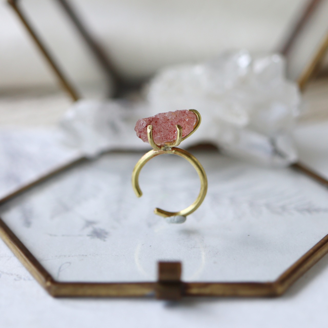 透明感のあるクォーツの中にピンク色の内包物が浮かぶストロベリークォーツ。ころんと存在感のある大きさをそのままに、真鍮の爪でシンプルに留め、ベビーリングのようなイヤーカフにしました。