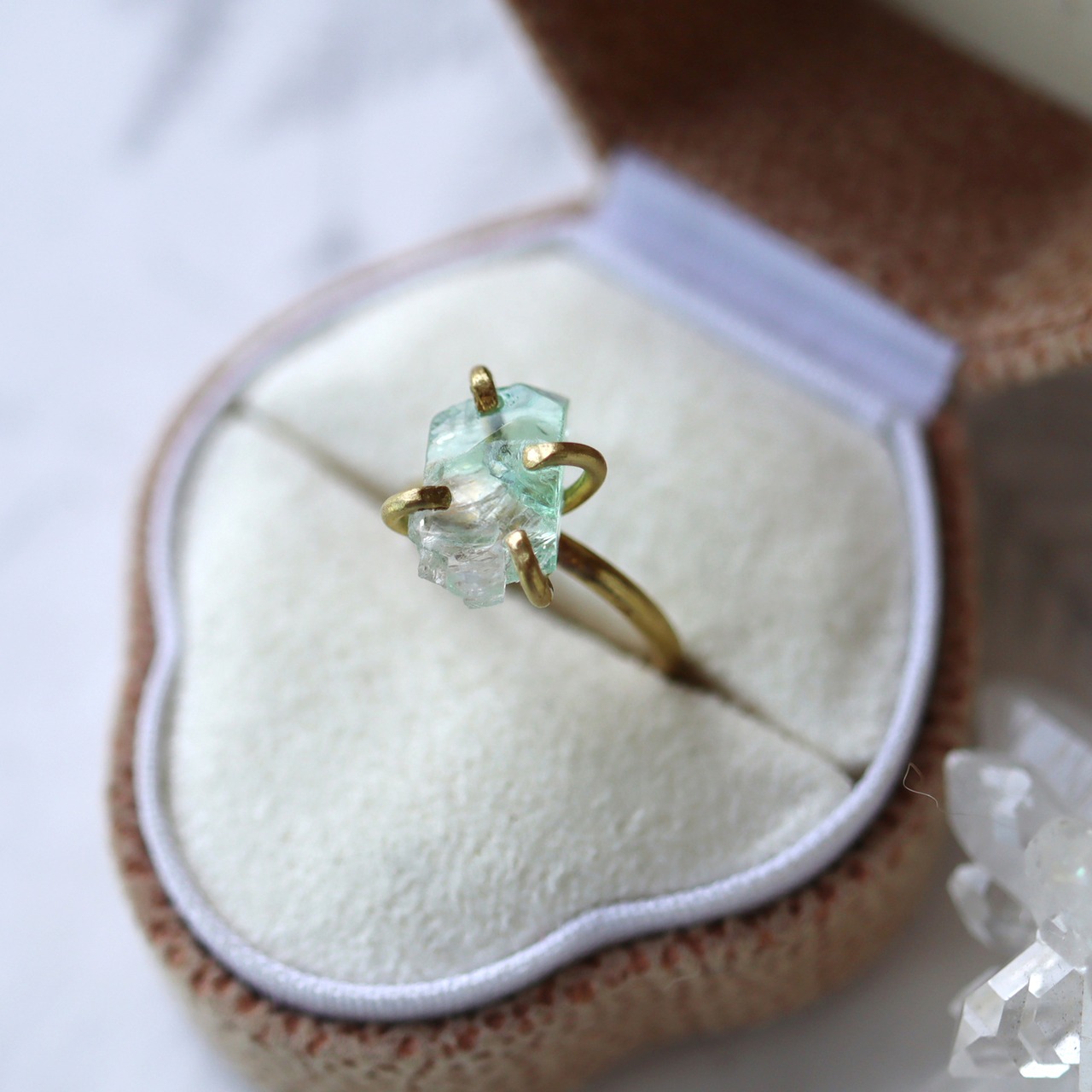 透明感のある石の中に、滲むような淡いグリーンが浮かぶフローライト。ころんと存在感のある大きさをそのままに、真鍮の爪でシンプルに留め、ベビーリングのようなイヤーカフにしました。