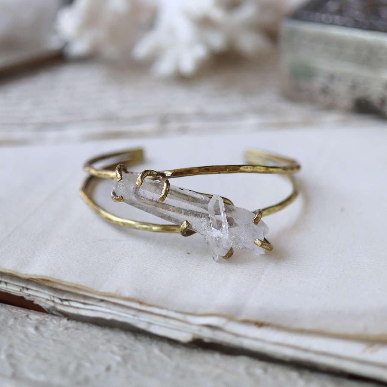 鉛筆型に育つ結晶がいくつか合体した美しい形、石内部のクラック(天然の傷)に光が反射し、虹色の光が見えるヒマラヤクォーツ。大振りで個性的な原石を、真鍮の爪で有機的に留めたバングルです。あたたかいゴールド色の真鍮は、使い込む程にアンティークな質感へと変化していきます。
