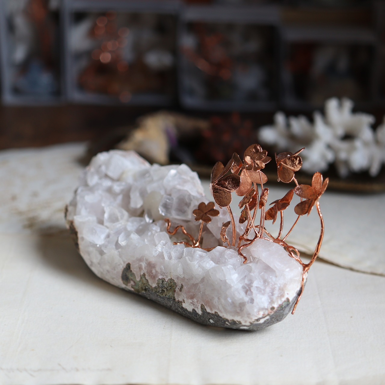 結晶の隙間に根を伸ばしわしゃわしゃと繁殖していくのはカタバミです。ハート形の葉が集まったかわいい印象のオブジェです。