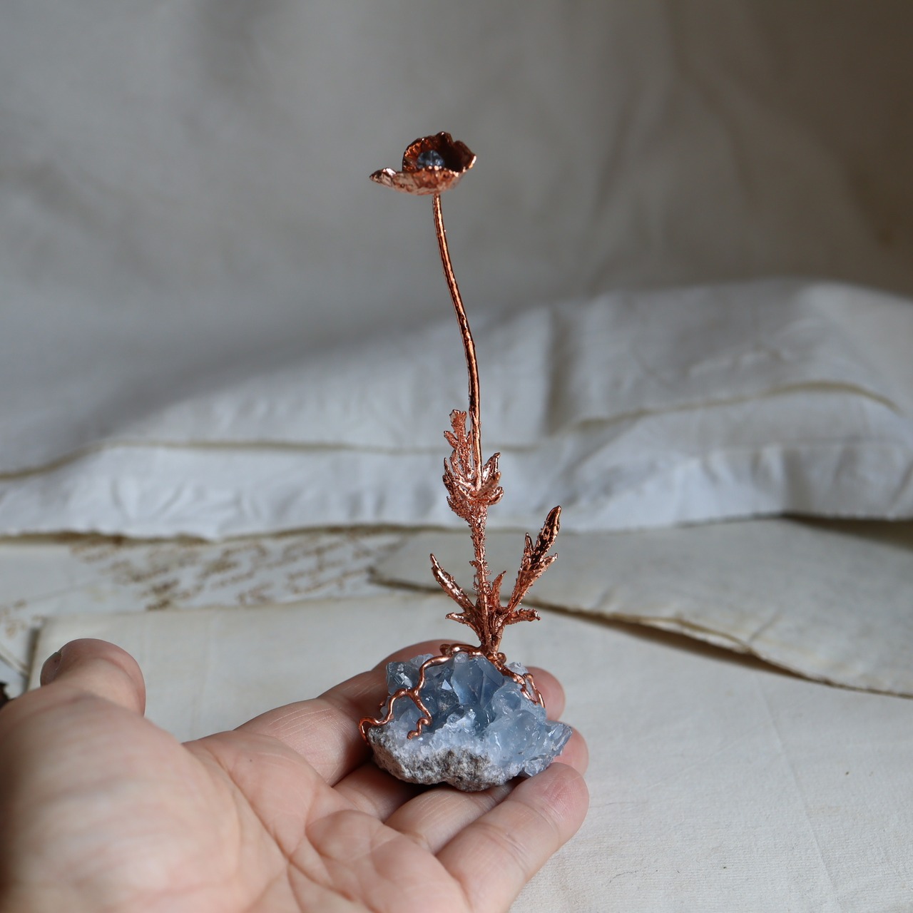 ブルーが美しいセレスタイトの結晶に、ケシの種が着生し花を咲かせたオブジェ。セレスタイトを養分に育った影響を受けて、淡いブルーの実をつけました。こちらはサファイアの原石です。