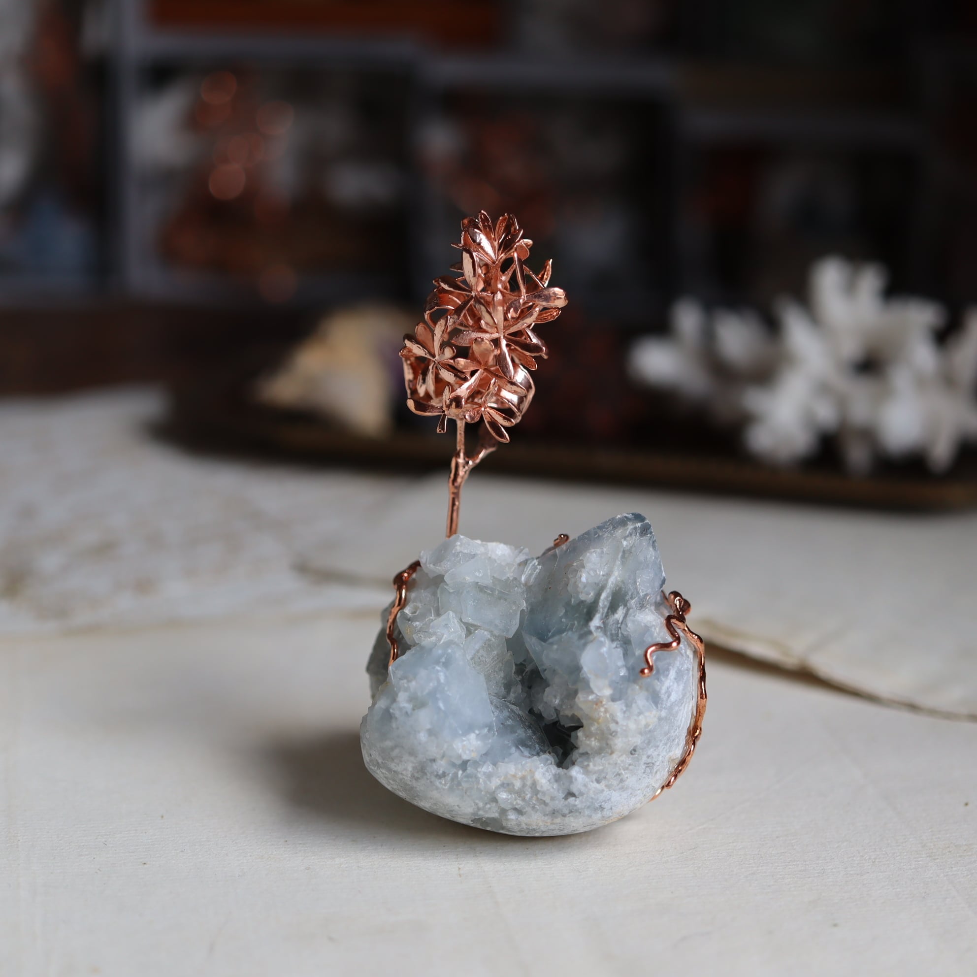 丸く切り出された母岩に淡いブルーの結晶が集まったセレスタイト。ころころ揺れる鉱物を抱え込むように根を伸ばし花を咲かせたのはアベリアです。花のように見えるのはがくの部分で、簡単にバラバラになってしまう五枚葉のパーツを別々に金属化した後、枝を軸に再構築しました。鉱物からすっくと伸びる”お花の樹”のオブジェです。