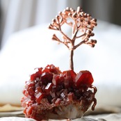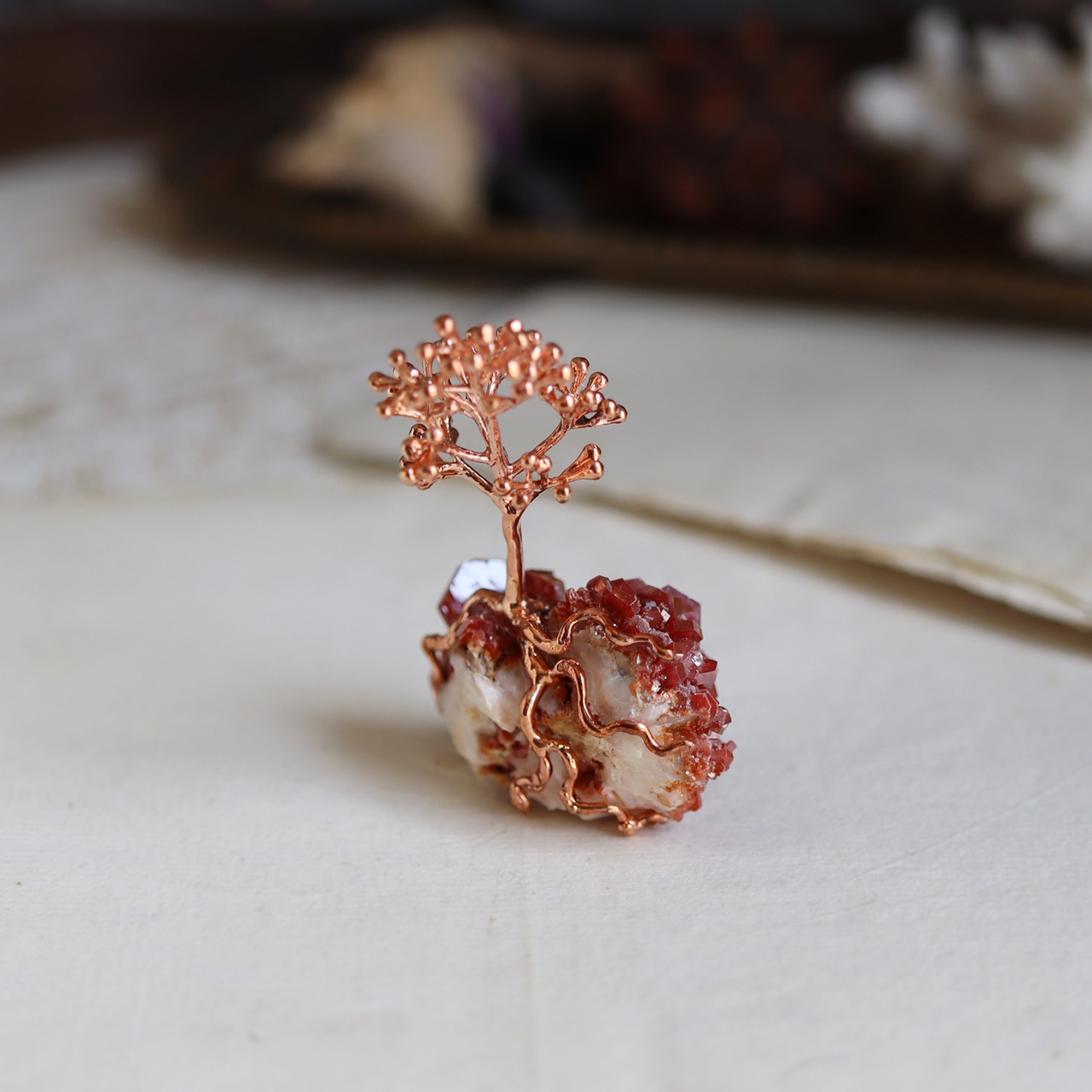 素材:バナジン鉛鉱(モロッコ産/Coud’a Mibladen Mining Dist.,Midelt)・クスノキ(銅コーティング)