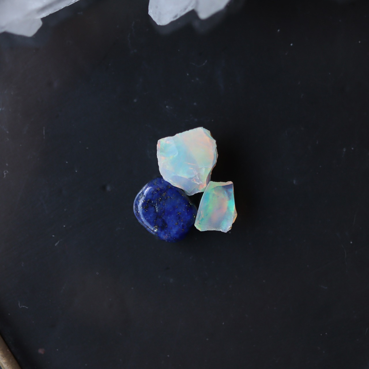 左端は透明感のある乳白色。ベースに青系、石全体に緑色のラメのような遊色が見えます。