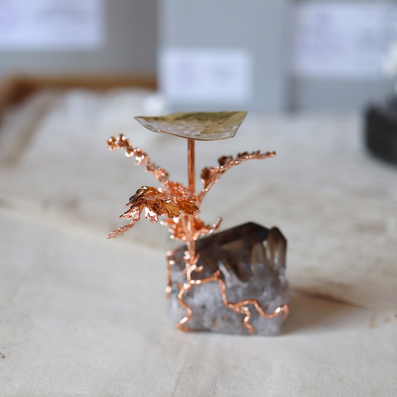 銅化した本物の植物と鉱物を使ったアートオブジェ。