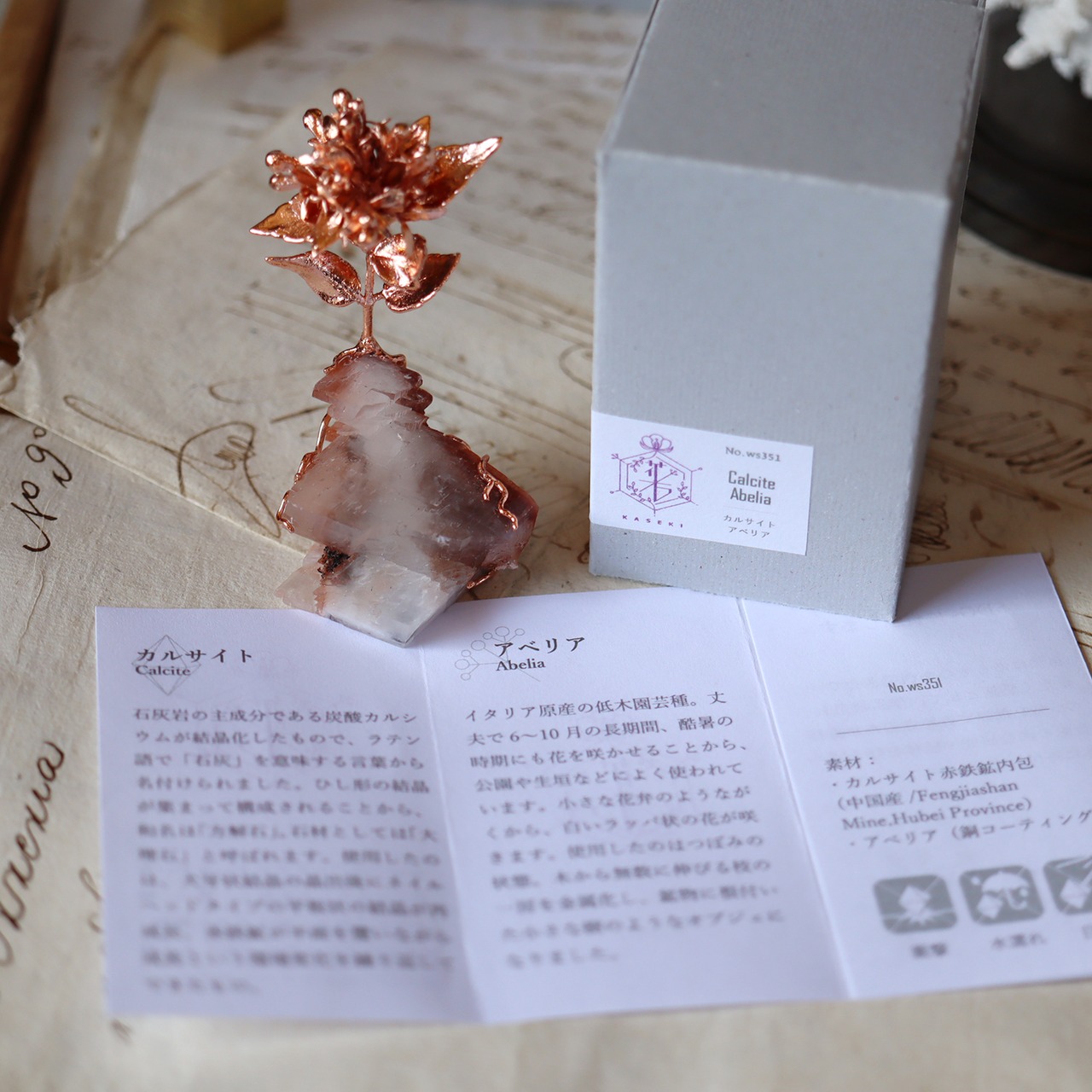 全ての作品にシリアルナンバーが付いており、オリジナルの箱と鉱物植物に関する説明書を同封します。自然造形の美しさはもちろん、ぜひどんな鉱物植物なのか背景も合わせてお楽しみください。