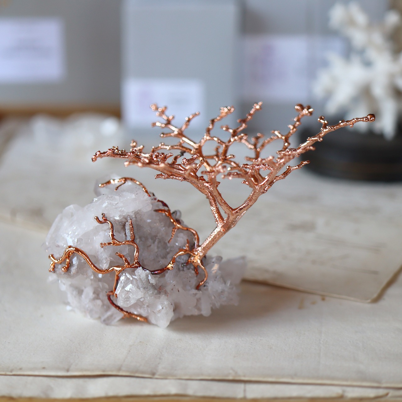 銅化した本物の植物と鉱物を使ったアートオブジェ。