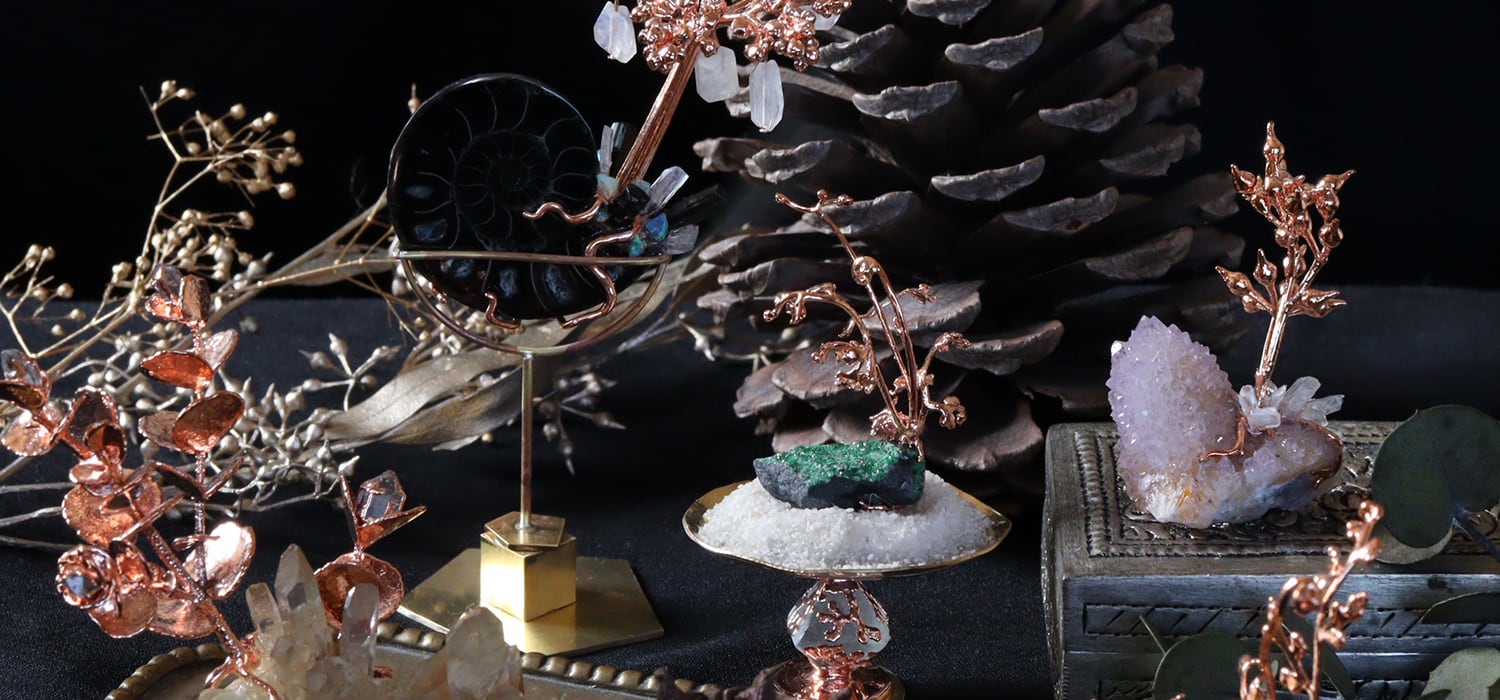 エレクトロフォーミングという錬金術のような技法により、植物の繊細な造形をそのまま金属化し、個性豊かな鉱物と組み合わせています。