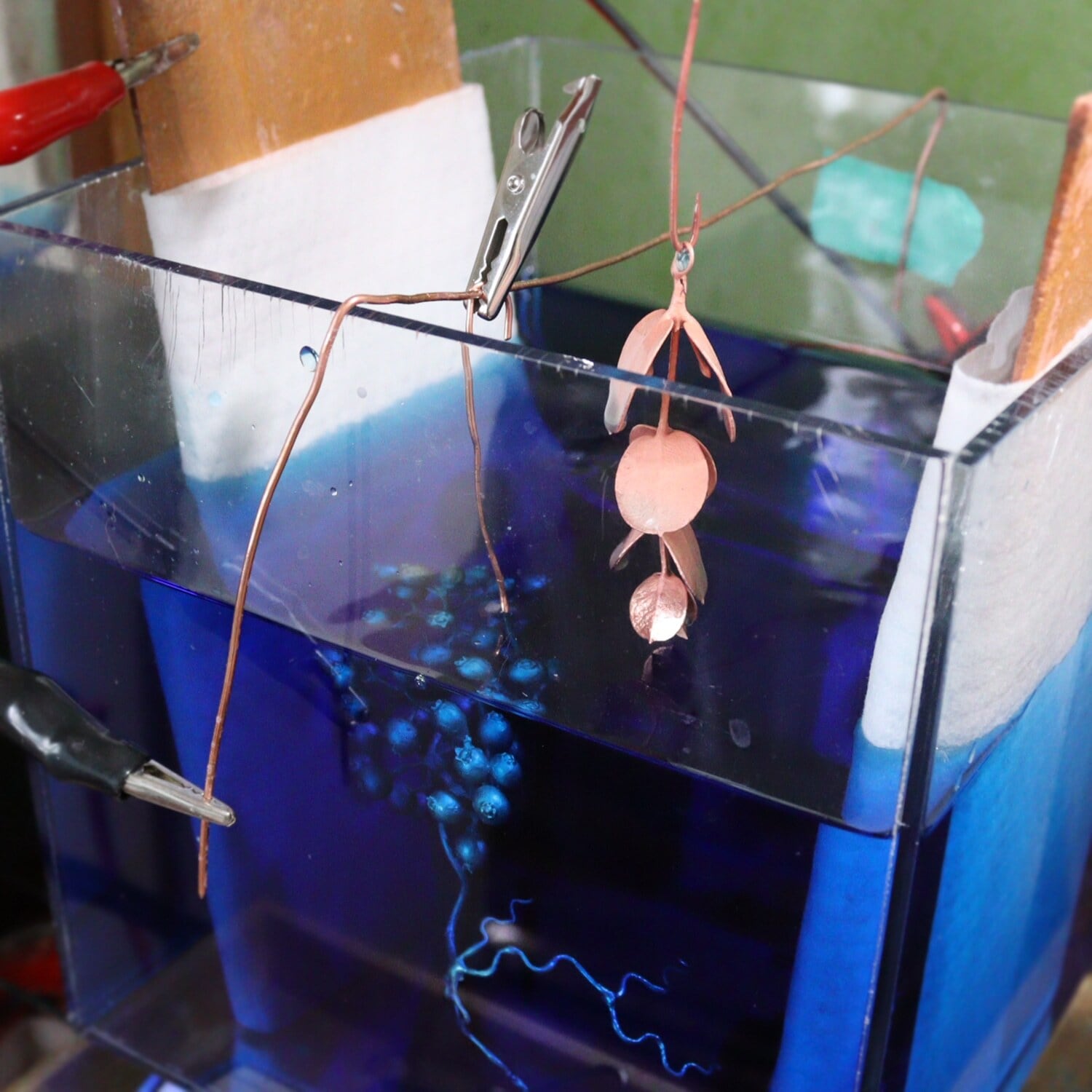 植物や鉱物など、金属ではないものの表面に電気メッキをかける技法。